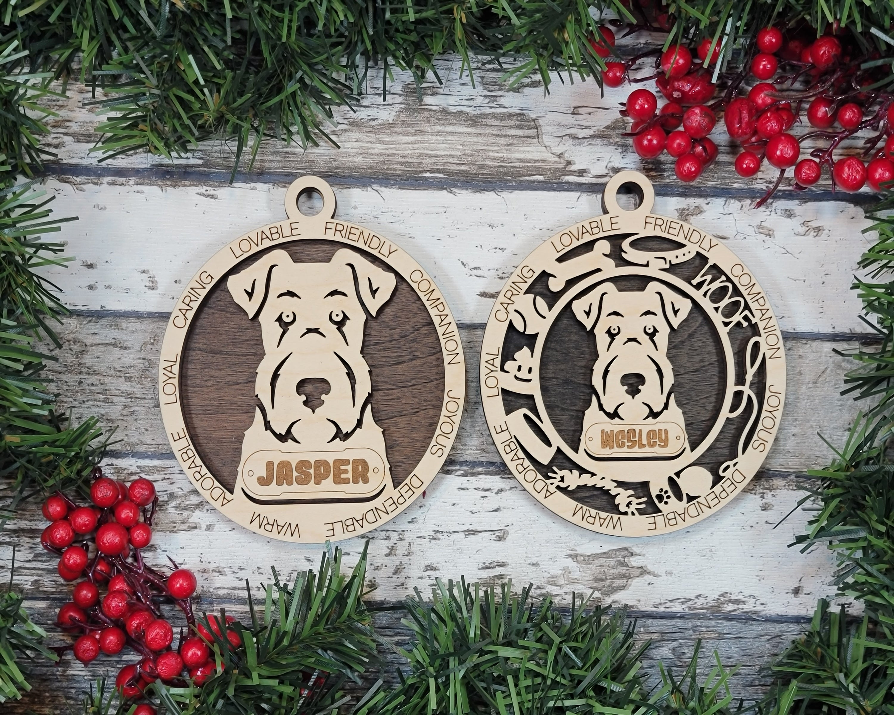 Specifications: The ornaments are 4" in diameter with a loop on top for a hanger and approximately 1/4 inch thick. The top layer is made of wood, and the backing layer can be selected from wood or acrylic materials.