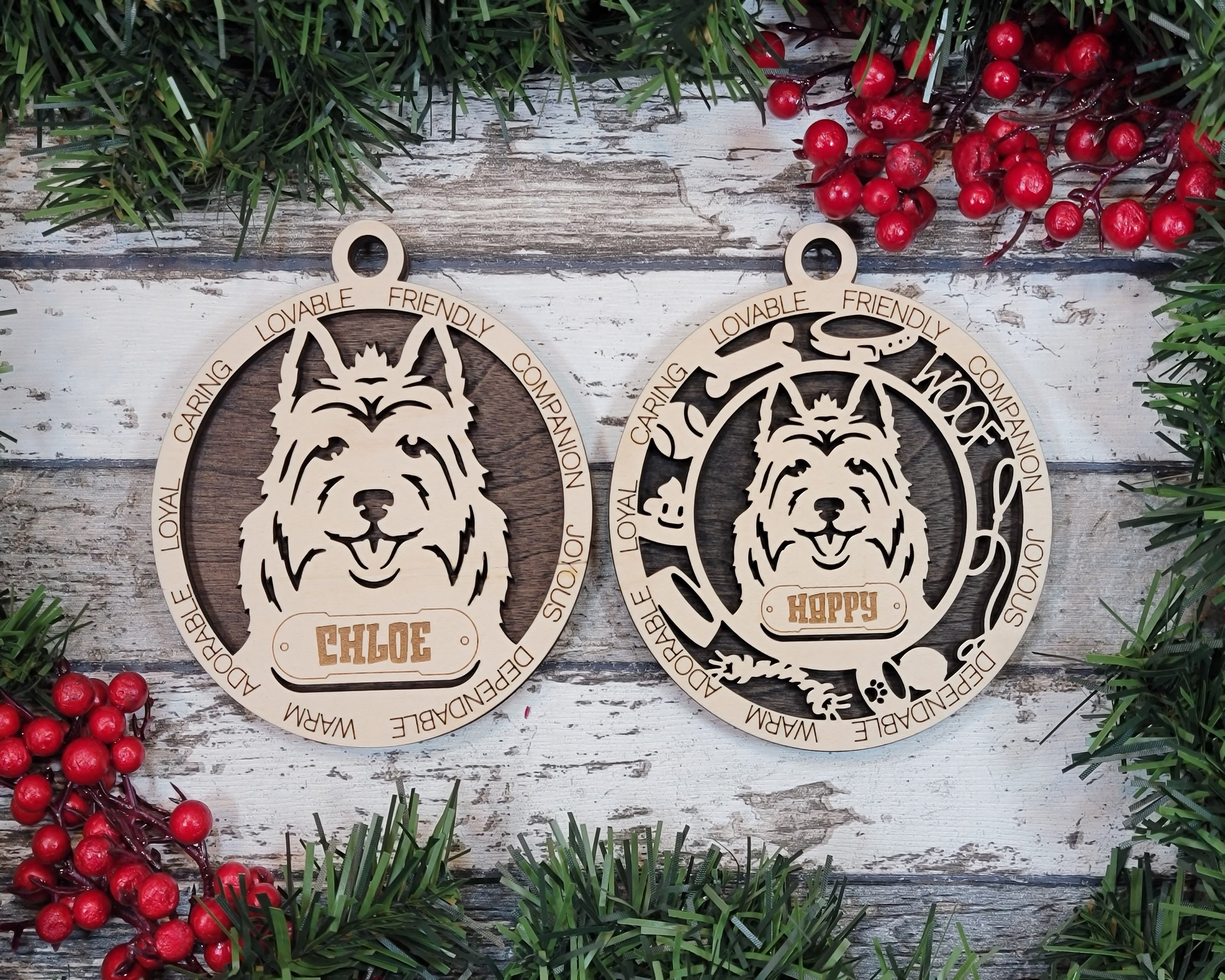 Specifications: The ornaments are 4" in diameter with a loop on top for a hanger and approximately 1/4 inch thick. The top layer is made of wood, and the backing layer can be selected from wood or acrylic materials.