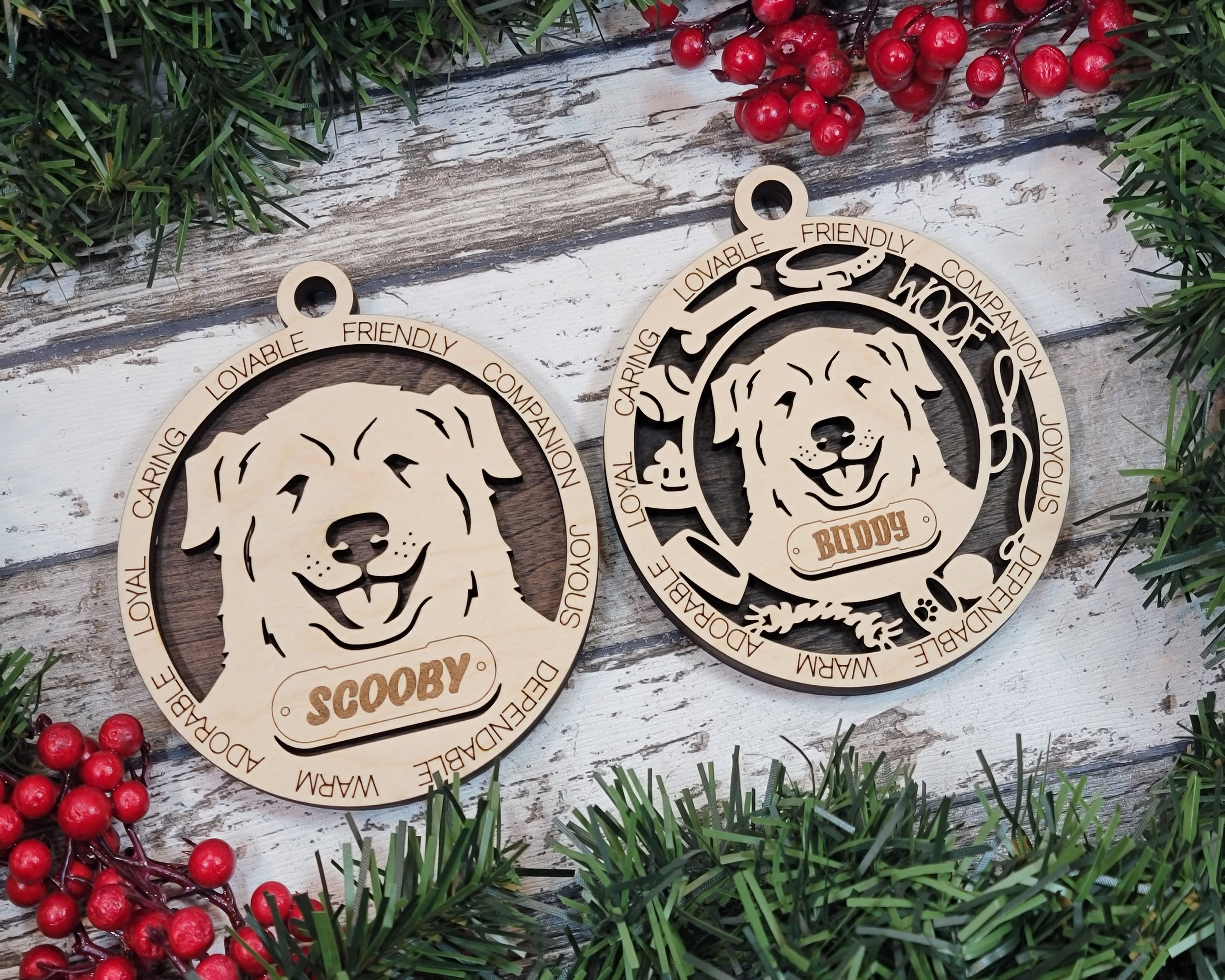 Specifications: The ornaments are 4" in diameter with a loop on top for a hanger and approximately 1/4 inch thick. The top layer is made of wood, and the backing layer can be selected from wood or acrylic materials.